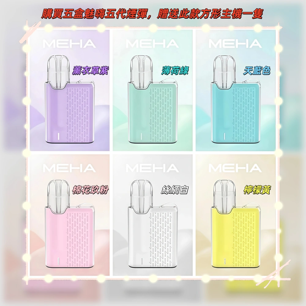 (限時活動:購買五盒MEHA魅嗨五代煙彈,贈送一隻MEHA五代方形主機)